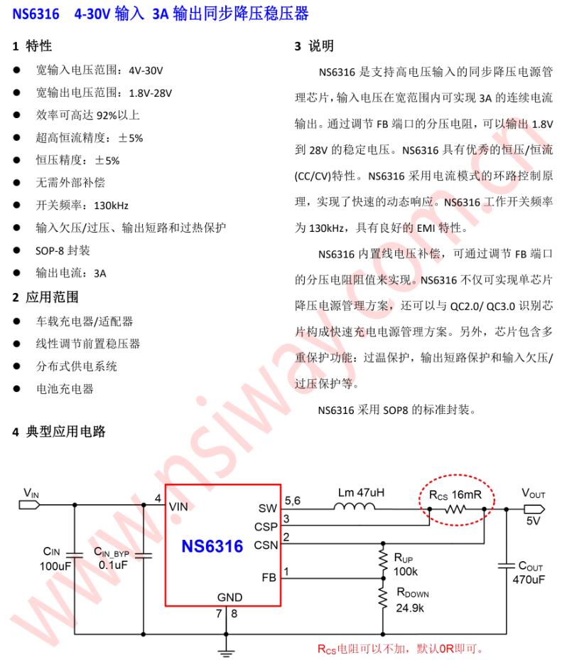理,實(shí)現(xiàn)了快速的動(dòng)態(tài)響應(yīng)。NS6316工作開關(guān)頻率為130kHz,具有良好的EMI特性。
