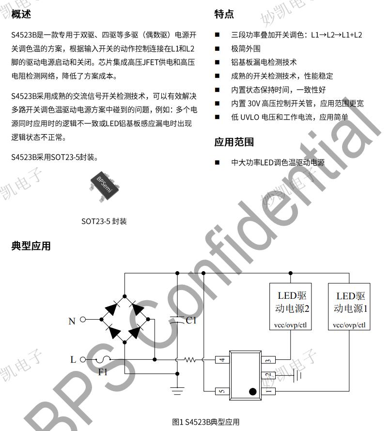 S4523B/RB是一款專(zhuān)用于雙驅(qū)、四等多驅(qū)(偶數(shù)驅(qū)) 電源開(kāi)關(guān)調(diào)色溫的方案,根據(jù)輸入開(kāi)關(guān)的動(dòng)作控制連接在L1和L2腳的驅(qū)動(dòng)電源啟動(dòng)和關(guān)閉。芯片集成高壓JFET供電和高壓電阻檢測(cè)網(wǎng)絡(luò),降低了方案成本。S4523B/RB采用成熟的交流信號(hào)開(kāi)關(guān)檢測(cè)技術(shù),可以有效解決多路開(kāi)關(guān)調(diào)色溫驅(qū)動(dòng)電源方案中碰到的問(wèn)題,例如:多個(gè)電源同時(shí)應(yīng)用時(shí)的邏輯不一致或LED鋁基板感應(yīng)漏電時(shí)出現(xiàn)邏輯狀態(tài)不正常。