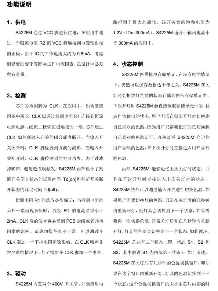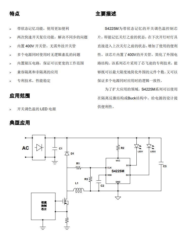 S4225M是帶狀態(tài)記憶功能的開關調色溫控制芯片,內部設定狀態(tài)切換窗口時間Tsw(典型值64S)關燈時間超過狀態(tài)切換窗口時間芯片會記住關燈前的狀態(tài),下次開燈時直接呈現關燈前的狀態(tài);關燈時間小于狀態(tài)切換窗口時間開燈則切換到下一個色溫狀態(tài),增加了使用的便利性。 S4225M通過檢測脈沖信號來判斷開關機狀態(tài),確保多個電源同時應用時的邏輯一致性,而且可以兼容 Flyback、Buck-Boost、Buck及線性等多種 LED 驅動方案。