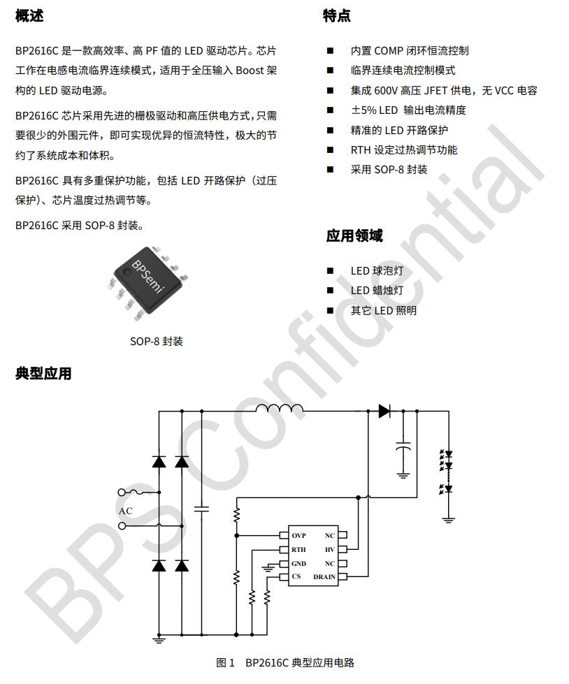 內(nèi)置COMP閉環(huán)恒流控制臨界連續(xù)電流控制模式集成600V高壓JFET供電,無(wú)VCC電容土5%LED輸出電流精度精準(zhǔn)的LED開(kāi)路保護(hù)RTH設(shè)定過(guò)熱調(diào)節(jié)功能采用SOP-8封裝