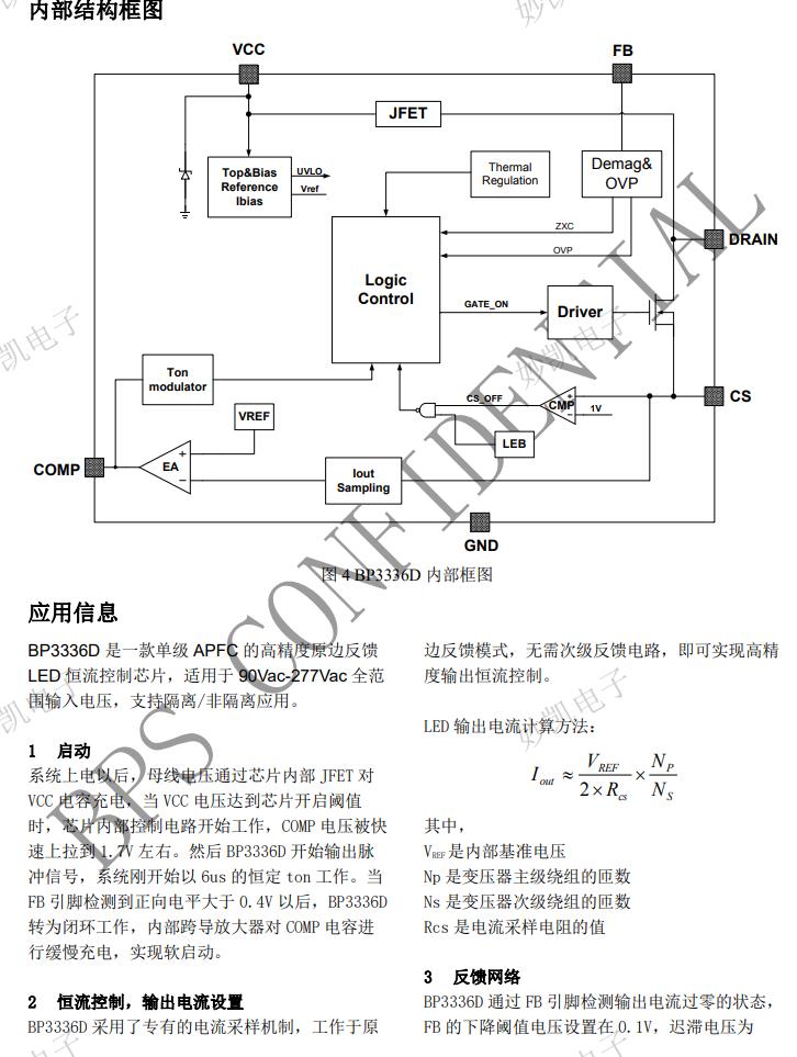 特點(diǎn) ? 輸入 90-277Vac ? 高 PF 低 THD(PF>0.9,THD<15%) ? 支持雙繞組 Flyback 拓?fù)?,無需輔助繞組 ? 內(nèi)置高壓啟動(dòng),啟動(dòng)時(shí)間<500ms ? 高精度電流參考(+/-3%) ? 優(yōu)異的線性、負(fù)載調(diào)整率 ? 臨界導(dǎo)通模式 ? 低工作電流 ? VCC 欠壓鎖定 ? 逐周期限流 ? 輸出開路/短路保護(hù) ? 過溫降電流 ? 支持 SOP-8 封裝