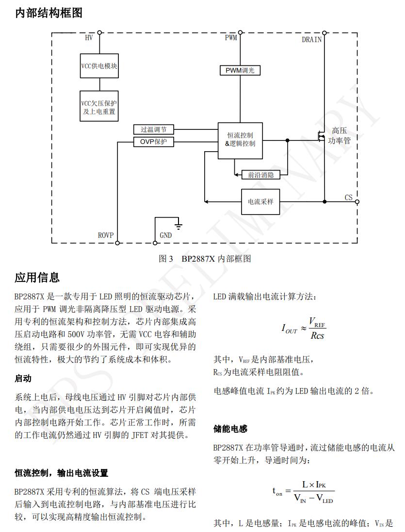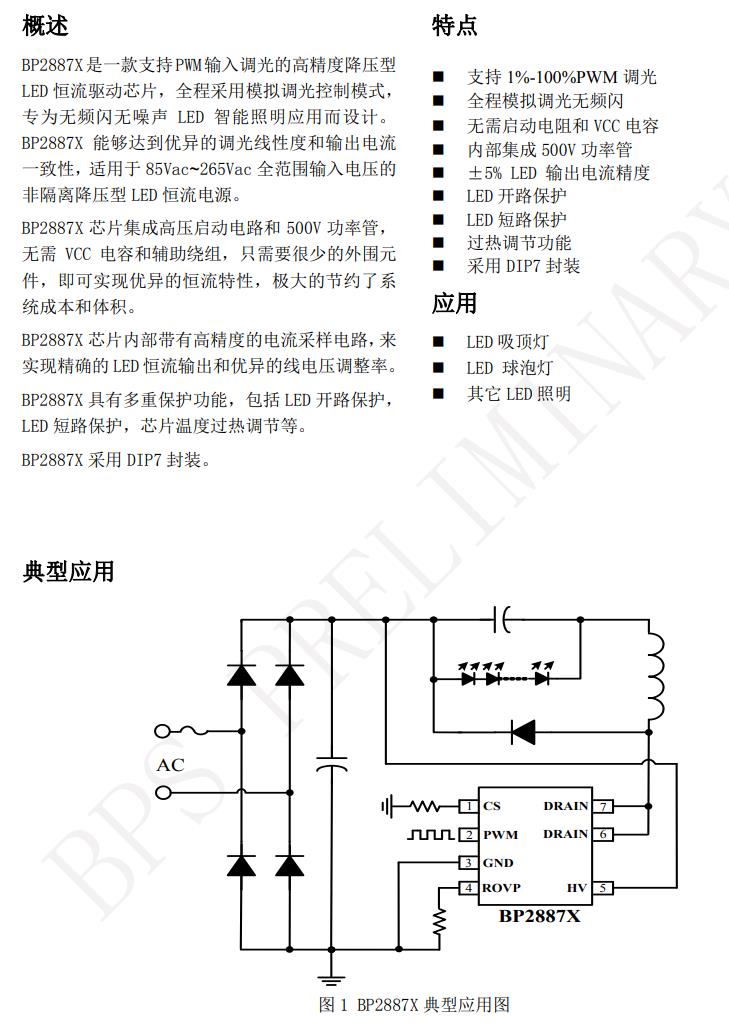 BP2887X 芯片內(nèi)部帶有高精度的電流采樣電路,來 實(shí)現(xiàn)精確的 LED 恒流輸出和優(yōu)異的線電壓調(diào)整率。 BP2887X 具有多重保護(hù)功能,包括 LED 開路保護(hù), LED 短路保護(hù),芯片溫度過熱調(diào)節(jié)等。