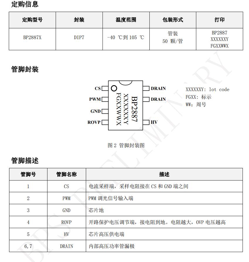 | BP2887G | DIP7 | 0.5 | BUCK | <50W | 500V/2Ω | Y | PWM |