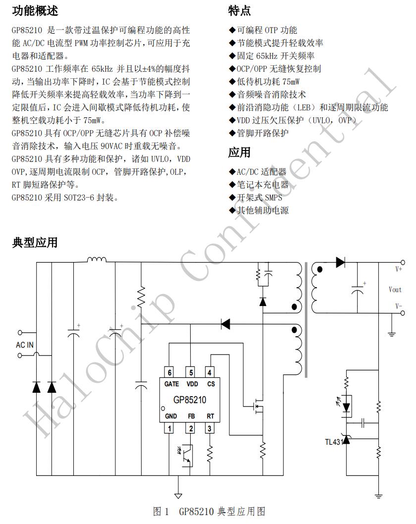 GP85210是一款帶過溫保護(hù)可編程功能的高性能AC/DC電流型PWM功率控制芯片,可應(yīng)用于充電器和適配器。
