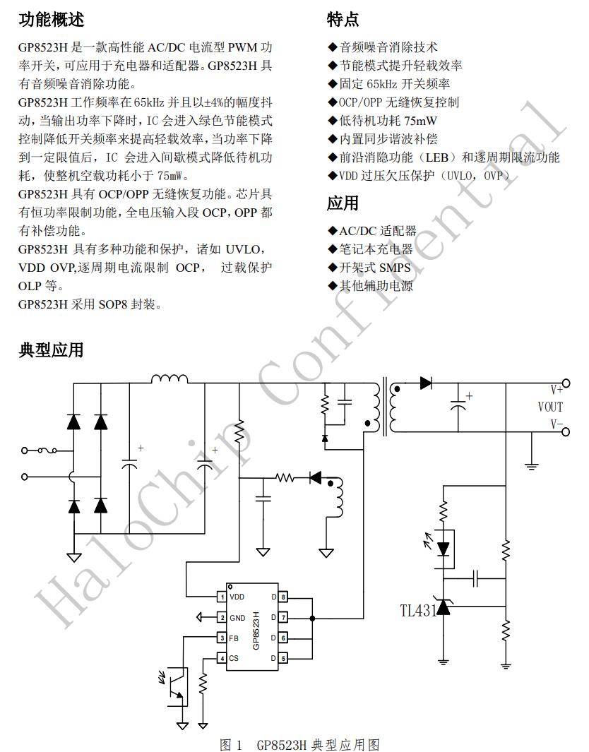GP8523H是一款高性能AC/DC電流型PWM功率開關,可應用于充電器和適配器。GP8523H具有音頻噪音消除功能。GP8523H工作頻率在65kHz并且以±4%的幅度抖動,當輸出功率下降時,IC會進入綠色節(jié)能模式控制降低開關頻率來提高輕載效率,當功率下降到一定限值后,IC會進入間歇模式降低待機功耗,使整機空載功耗小于75mW。