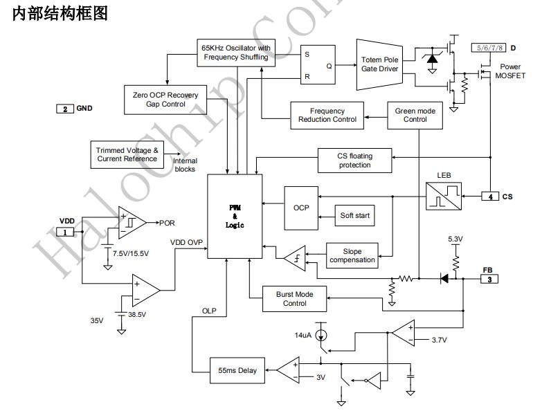 音頻噪音消除技術節(jié)能模式提升輕載效率固定65kHz開關頻率OCP/OPP無縫恢復控制低待機功耗75mW內置同步諧波補償前沿消隱功能(LEB)和逐周期限流功能VDD過壓欠壓保護(UVLO,OVP