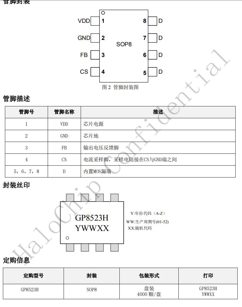 GP8523H具有多種功能和保護,諸如UVLO,VDDOVP,逐周期電流限制OCP,過載保護OLP等。