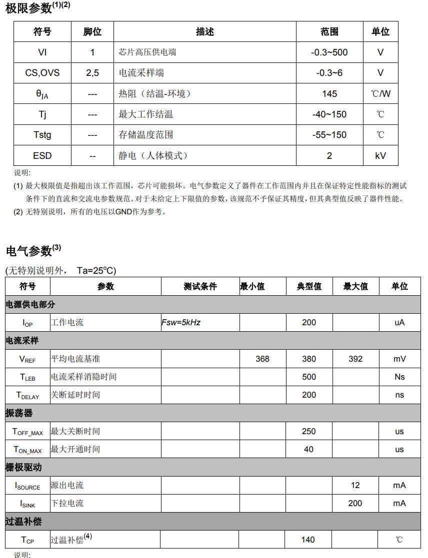 特點(diǎn) ? 無(wú)VCC電容 ? 高壓供電,無(wú)啟動(dòng)電阻 ? 寬電壓輸入電壓 ? ±5% LED輸出電流精度 ? 電感電流臨界模式 ? 外置可編程開路保護(hù) ? LED短路保護(hù) ? 過(guò)溫補(bǔ)償