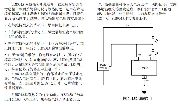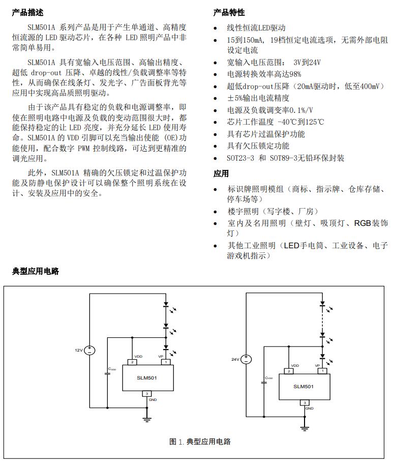 SLM501A 系列產(chǎn)品是用于產(chǎn)生單通道、高精度恒流源的 LED 驅(qū)動(dòng)芯片,在各種 LED 照明產(chǎn)品中非常簡(jiǎn)單用。SLM501A 具有寬輸入電壓范圍、高輸出精度、超低 drop out 壓降、卓越的線性/負(fù)載調(diào)整率等特性,從而確保在線條燈、發(fā)光字、廣告面板背光等應(yīng)用中實(shí)現(xiàn)高品質(zhì)照明驅(qū)動(dòng)。SLM501A 的 VDD 引腳可以充當(dāng)輸出使能 (OE)功能使用,配合數(shù)字 PWM 控制線路,可達(dá)到更精準(zhǔn)的調(diào)光應(yīng)用。此外,SLM501A 精確的過溫保護(hù)功能及防靜電保護(hù)設(shè)計(jì)可以確保整個(gè)照明系統(tǒng)在設(shè)計(jì)、安裝及應(yīng)用中的安全。