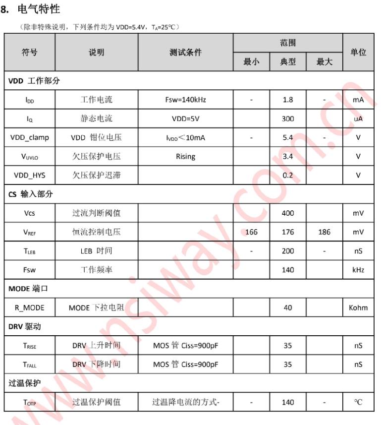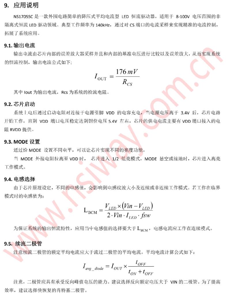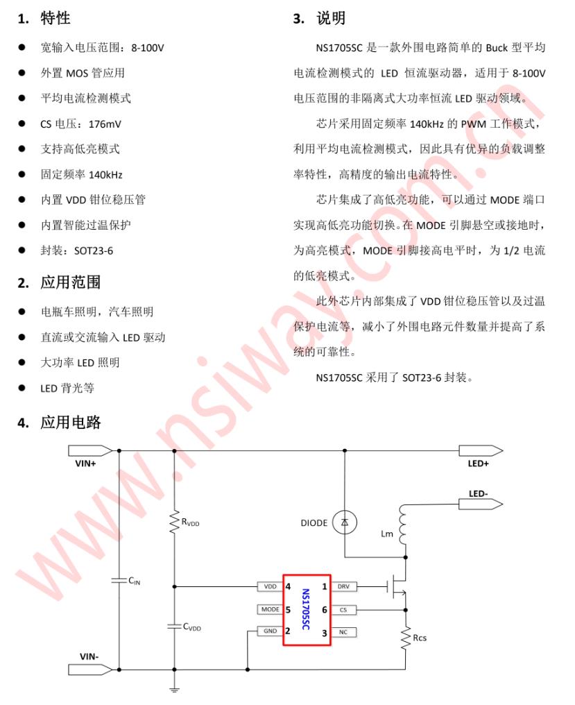 NS1705SC是一款外圍電路簡單的Buck型平均電流檢測模式的LED恒流驅(qū)動器,適用于8-100V電壓范圍的非隔離式大功率恒流LED驅(qū)動領(lǐng)域。芯片采用固定頻率140kHz的PWM工作模式,利用平均電流檢測模式,因此具有優(yōu)異的負(fù)載調(diào)整率特性,高精度的輸出電流特性。芯片集成了高低亮功能,可以通過MODE端口實現(xiàn)高低亮功能切換。在MODE引腳懸空或接地時,為高亮模式,MODE引腳接高電平時,為1/2電流的低亮模式。此外芯片內(nèi)部集成了VDD鉗位穩(wěn)壓管以及過溫保護(hù)電流等,減小了外圍電路元件數(shù)量并提高了系統(tǒng)的可靠性。NS1705SC采用了SOT23-6封裝。