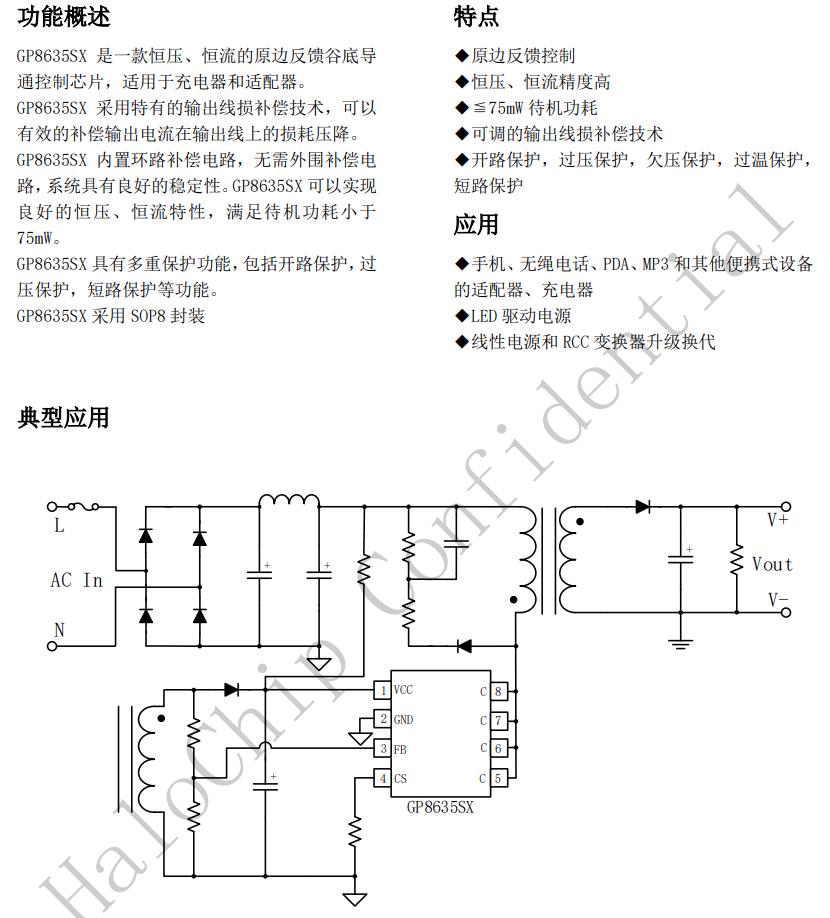 GP8635SX內(nèi)置環(huán)路補(bǔ)償電路,無需外圍補(bǔ)償電路,系統(tǒng)具有良好的穩(wěn)定性。GP8635SX可以實(shí)現(xiàn)良好的恒壓、恒流特性,滿足待機(jī)功耗小于75mW。