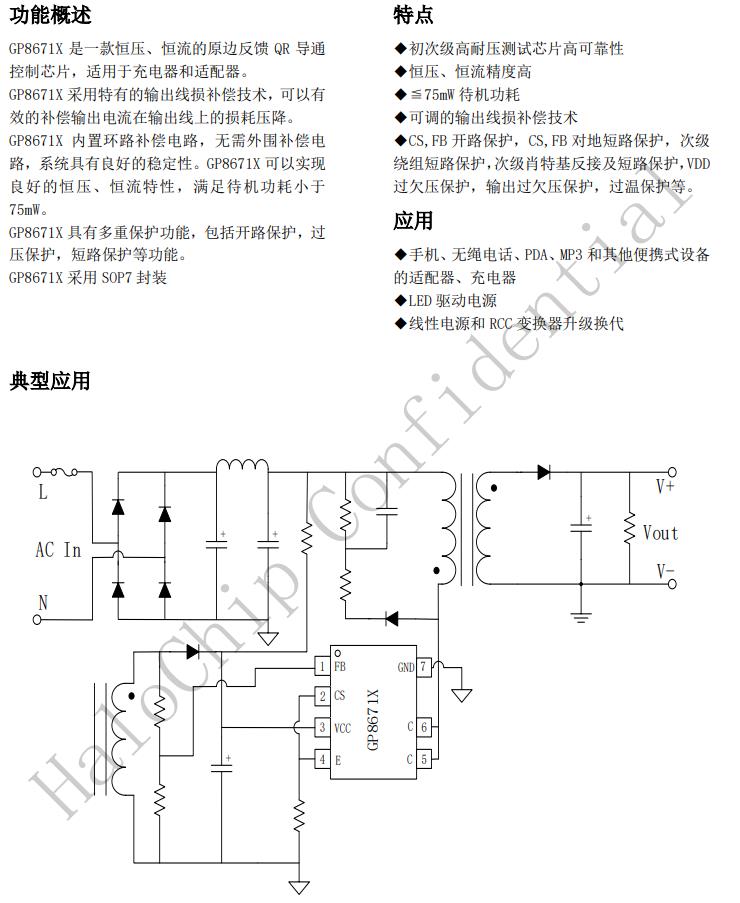 初次級(jí)高耐壓測試芯片高可靠性恒壓、恒流精度高≦75mW待機(jī)功耗可調(diào)的輸出線損補(bǔ)償技術(shù)CS,F(xiàn)B開路保護(hù),CS,F(xiàn)B對(duì)地短路保護(hù),次級(jí)繞組短路保護(hù),次級(jí)肖特基反接及短路保護(hù),VDD過欠壓保護(hù),輸出過欠壓保護(hù),過溫保護(hù)等。